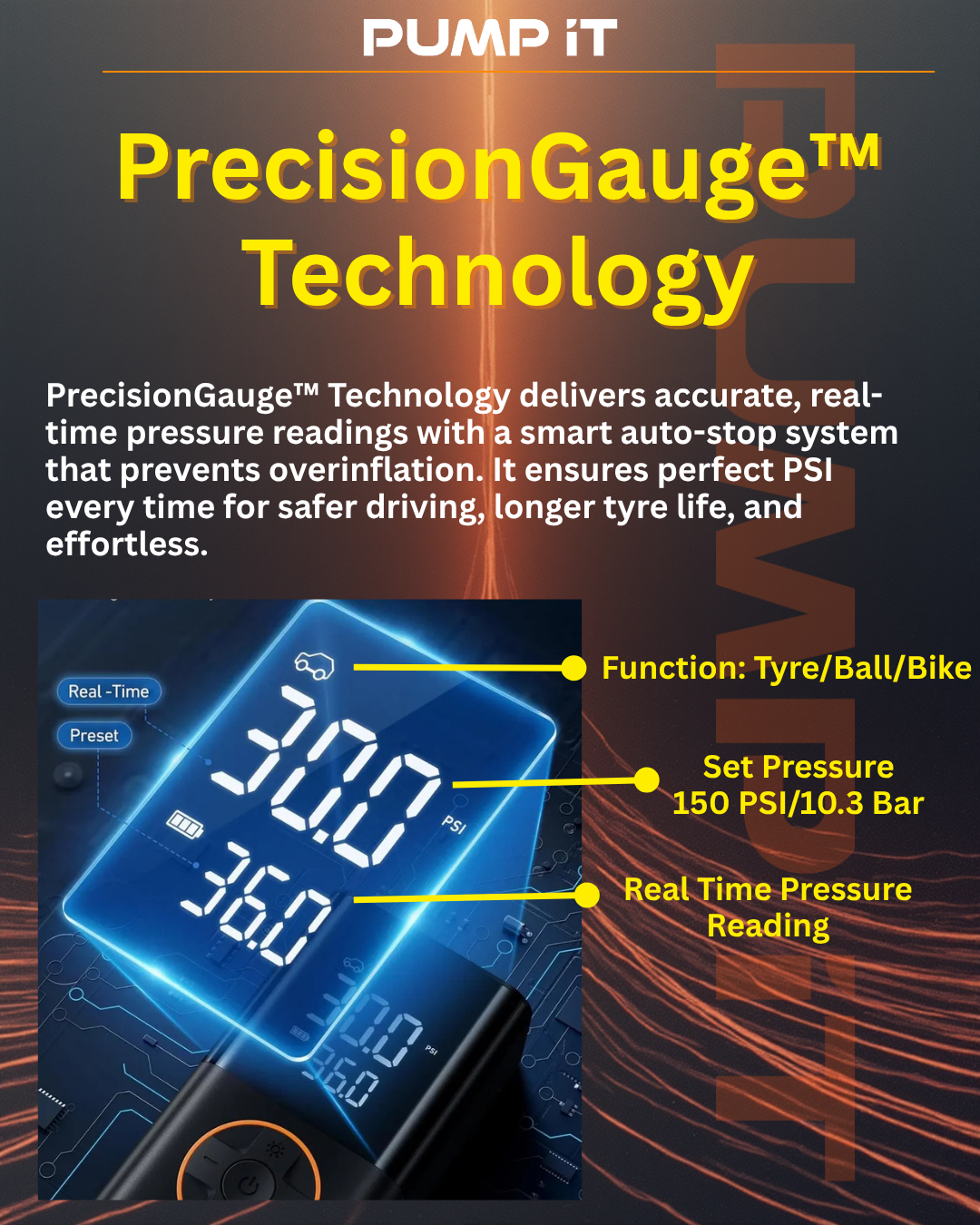 Pump It's breakthrough PrecisionGauge™ Technology is the missing piece. It's not just 'another portable pump'—it's the first inflator that thinks for you. Set your target PSI, press start, and walk away. It monitors pressure in real-time and auto-stops at perfection. That's why it works where everything else hasn't.
